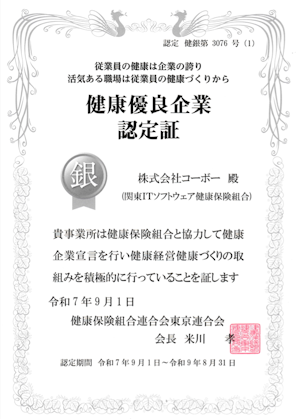 弊社株式会社コーボーは、健康保険組合連合会東京連合会に「健康企業宣言」を行い、健康経営に向けた積極的な取り組みが評価され、2024年8月8日付で健康優良企業「銀の認定証(※)」を取得いたしました。(健銀第3076号)